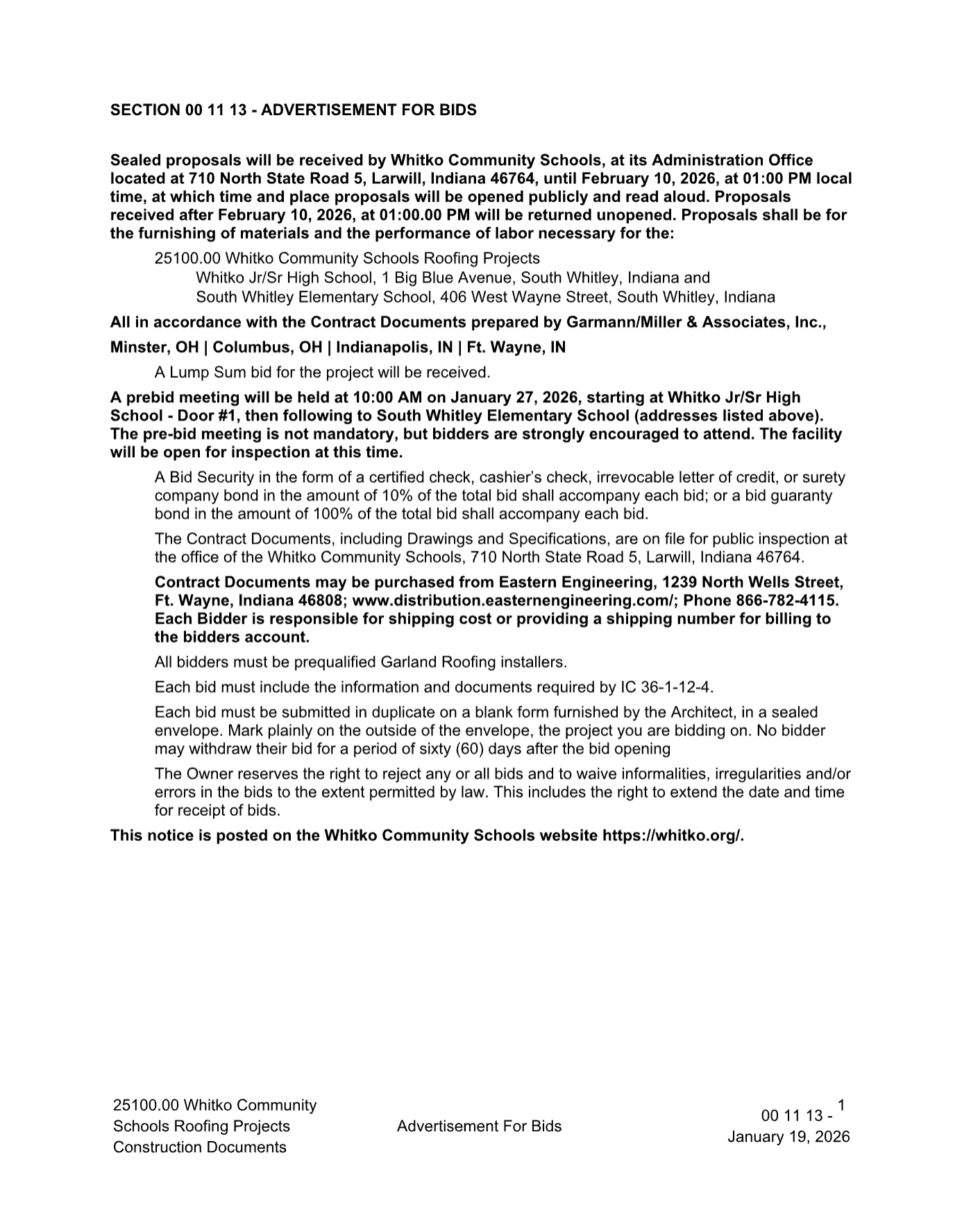 REGULAR SCHOOL BOARD MEETING: Monday, February 16, 2026, 5:30 p.m., Whitko Career Academy Lecture Room